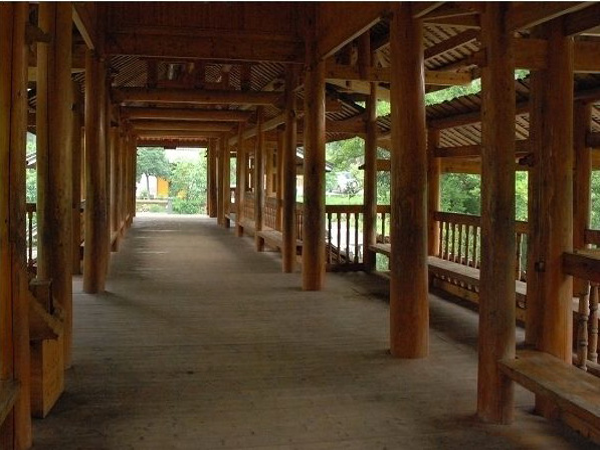 瑤族風雨橋,基本上都是跨河而建,主要由三部分組成:分別是下部的墩臺,中部的跨河游廊,上部的廊亭和閣樓。底層的石作與主體木作搭配結合。從風雨橋本身功能來說,廊橋頂面的舍瓦屋面,有利于排水。通透而寬敞的廊橋,適合采光、通風和遮雨。同時,石作橋墩堅固耐用,以鄉土水杉作為橋身主材,在群山環繞、濕熱多雨的亞熱帶氣候中,能夠屹立400余年,至今依然保持其使用功能。