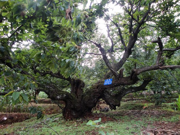 一是:徐霞客在農歷八月十五的時候來到尋甸,第一次嘗到了炒板栗,認為這是人間美味的他,順手抓了一把混雜生熟的栗子就放進兜里。步行數月后,在臘月來到了當時的鳳尾村(寺前村),受到熱情款待的徐霞客身上的盤纏不多了,為了表達謝意,就把栗子送給了農戶去播種,因為栗子有些受潮發霉,所以僅僅成活了幾棵。但是到了現在,以及連成了一片古樹林。