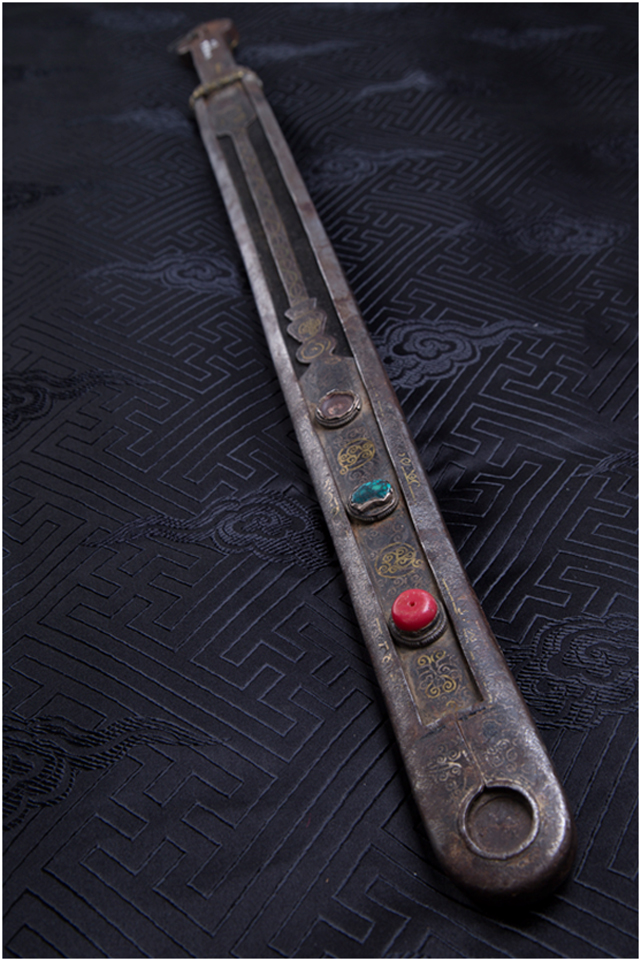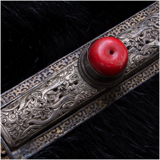 安多地區主要以放牧為主,牧民的刀主要用于宰殺和吃肉,有嚴格的男用女用之分,男式刀長度在一尺以上,女式刀在一乍左右,刀鞘的底部和刀柄的末端上翹,呈船形。安多人喜歡珠寶,頭飾、胸飾、腰飾無不光燦耀人,這些飾物同樣被用在刀上,刀鞘和刀柄錨金錯銀,鑲嵌著珊瑚和綠松石,像精美的藝術品。