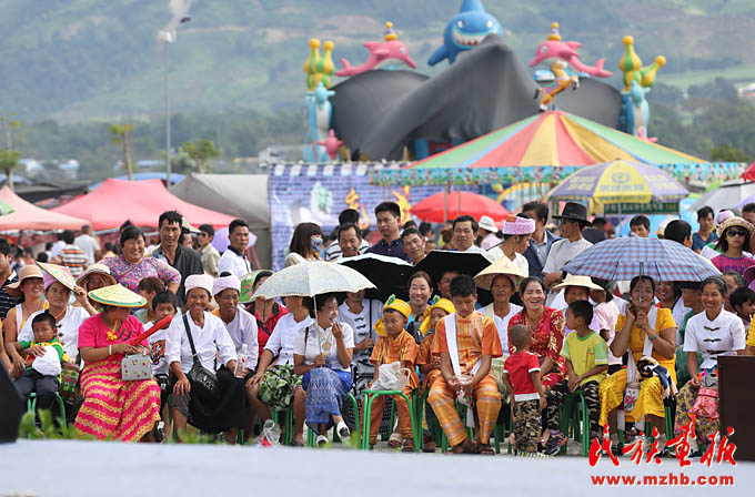 慶典活動上人潮涌動,氛圍隆重。位于文化廣場的演出中心區,傣族情歌對唱、孔雀舞表演、傣拳武術表演、傣劇等節目輪番上臺。在舞臺四周,一座座簡易搭建的攤位前,賣有傣族服飾、貨品、傣文書籍等。街道兩旁的小吃一條街,擺有竹筒粑粑、撒撇、楂子、地瓜等特色美食。
