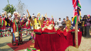 赫哲族漁民捕魚時首先要舉行隆重的祭江儀式。今年的捕魚開江儀式和大馬哈漁獵文化節同時舉行,由當地赫哲族大薩滿尤軍帶領眾人在烏蘇鎮的抓吉山下的江邊舉行。抓吉是赫哲語“濕地上一片高崗”的意思。赫哲族的漁民們認為,捕魚是向大江索取,因此,捕魚前必須要祭江神,以保佑漁民出江出海平平安安,滿載而歸。