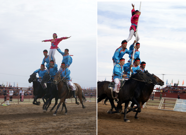 蒙古族的馬術(shù)表演非常精彩,有很多項(xiàng)目。“跨越障礙”是在運(yùn)動(dòng)場(chǎng)跑道上每隔幾十米設(shè)置一個(gè)高1米的跨欄。跑道終端立著一個(gè)直徑約2米的火圈,矯健的坐騎從起跑線踏蹄起跑,越過跨欄,鉆過火圈直達(dá)終點(diǎn)。“乘馬斬劈”是在200-250米的距離之間樹起十幾個(gè)目標(biāo)。騎手們手持馬刀,疾馳如飛,經(jīng)過一個(gè)個(gè)目標(biāo)時(shí)舉刀劈砍,刀起標(biāo)落。“馬上技巧”是由運(yùn)動(dòng)員們?cè)陲w馳的馬背上做出各種造型動(dòng)作。運(yùn)動(dòng)員一般八九歲就要在馬術(shù)隊(duì)接受嚴(yán)格的訓(xùn)練。技巧表演可分單項(xiàng)和多項(xiàng),其中又包括單人單馬、單人雙馬、雙人雙馬和多人多馬。一匹飛奔的馬經(jīng)過騎手身邊,騎手可以突然抓住馬鬃翻身上馬,又會(huì)突然下馬腳尖點(diǎn)地再躍上馬背。其他技巧還有在馬背上“空翻倒立”“側(cè)方隱蔽”“樓里藏身”以及驚險(xiǎn)的“馬上疊羅漢”等表演【如圖,劉軍攝影,編者修剪合成兩圖】。