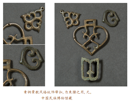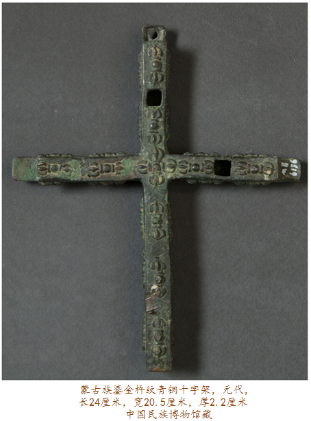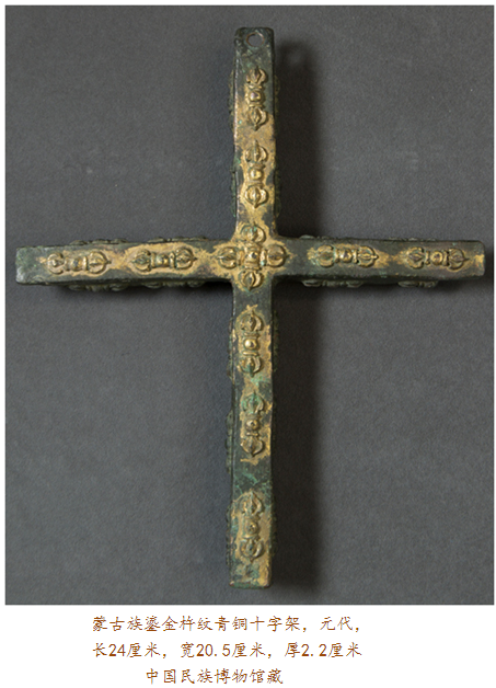 眼前此件在內蒙古達茂旗出土的元代鎏金青銅十字架,四面排列有浮雕金剛杵紋,其正面每個金剛杵圖案上均有鎏金裝飾,十字架上部穿孔則可用于懸掛。金剛杵是藏傳佛教里的修行法器,象征力量與智慧;而十字架則是基督教文化的標志,如此混搭,歷史便要傳遞出種種:在信仰藏傳佛教的蒙古高原,金剛杵,象征無畏圓滿,十字架,則代表救贖重生,東西方文化的結合亦呈現某種文明可能達到的無可比擬之高度。
