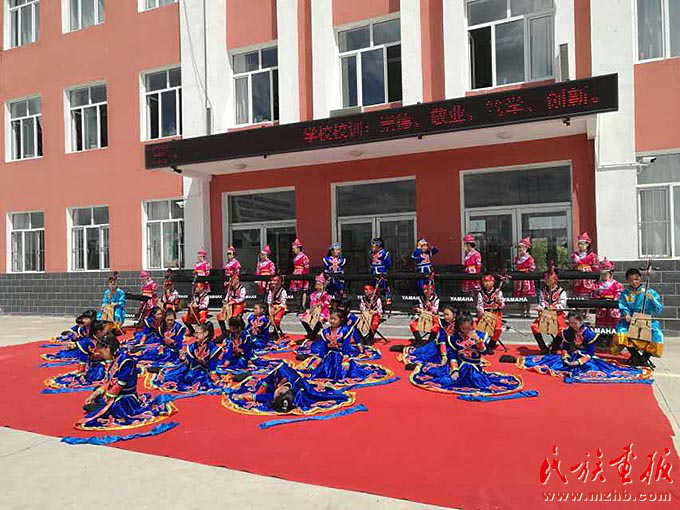 農(nóng)牧民的孩子們?cè)诩议T(mén)口的小學(xué)里也能接受到專業(yè)系統(tǒng)的藝術(shù)教育,圖為孩子們?cè)谶M(jìn)行才藝表演