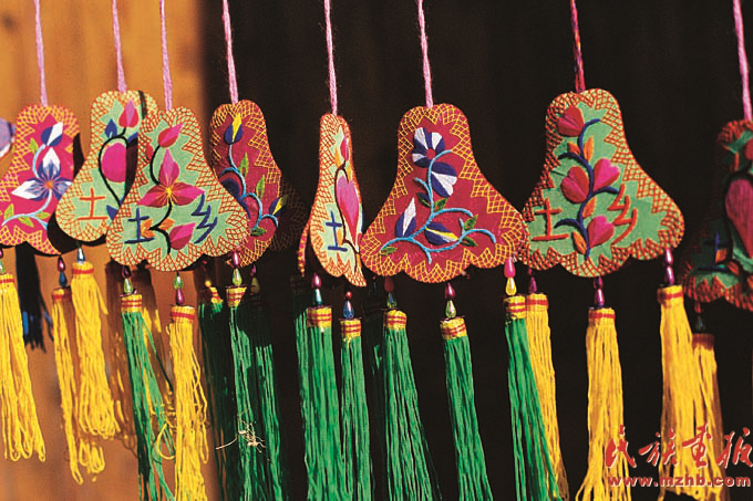 土族盤繡為當地婦女帶來了不少經濟收入。圖為線條流暢、層次豐富、撞色奔放、針腳細膩的土族盤繡荷包(祁春英 攝影)
