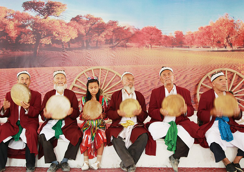 11歲的麥迪娜是小學五年級的副班長,在麥蓋提一小雙語班讀書,漢語好到可以給我做翻譯,向老藝人提問。麥迪娜的世界已經和老藝人、和叢林中艱難漁獵的祖先不一樣了。她在麥西來甫中敲達甫手鼓,在活動中心學習電子琴,是女子“手鼓樂隊組合”中8位11—3歲女孩子中的一個。她希望將來能在北京上學、成為醫生治好奶奶的糖尿病。她會用漢語唱國歌和《歌聲與微笑》,還有《茉莉花》,雖然吐字與調子不太那么準。她圍著阿布都克萊姆(被稱作“維吾爾人的趙本山”的維吾爾族諧星)索要簽名的同時,還喜歡羅志祥,以韓國偶像組合EXO為榜樣。麥迪娜還上過電視,常有喀什地區的、自治區的、全國的媒體到麥蓋提來采訪、錄制刀郎麥西來甫。