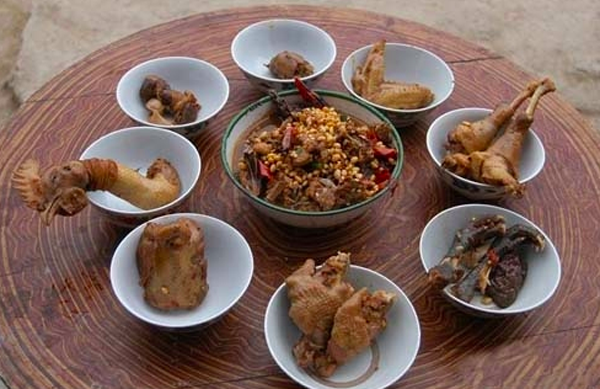 “頭”:第一種說法是頭給主人,稱之為“頭不出外”;第二種說法是給客人,表示尊敬;第三種說法是布依族青年男女訂婚時,吃頭的人要把雞腦先剝取出來給大家看,稱之為“吃雞還雞”(因為一個完整的雞腦就活像一只小雞娃),“卦”兩只,原則上是主、客人各一只,稱之為主客平等,表示友好往來。布依族辦紅白喜事或是過年時,都要看“卦”,測算辦的喜事是否吉祥,來年五谷豐登,六畜興旺等,稱之為“吃雞看卦”。看“卦”的內容多,道理也比較深奧。其余部位按對象依次分配,它的解釋也較多,吃“雞八塊”時最為講究的有兩點:一是須由主人分配,得“頭”的人號召后,方能開席。二是對好“卦”、吉祥“卦”,主人都將其放在自家神堂上。以示四季平安,吉祥如意。