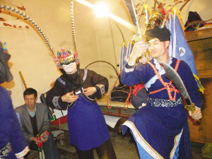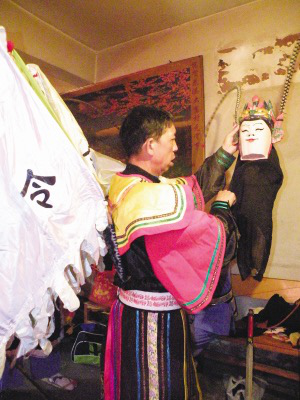 請“臉子”是地戲表演時一個非常講究的開場儀式。“屯堡地戲”的請臉子儀式通常是整個戲班子的人都必須參加祭拜。表演時必須鄭重地從箱子里請出珍藏的“臉子”,“臉子”才具有神的靈性。可是我們看到的大寨布依地戲,在保持傳統的同時又不失自己的個性。通常請“臉子”是由當地長老一個人完成所有的祭拜過程,一切都是那么簡單。祭拜中都是用當地的布依話娓娓道來,這樣的表演給它增添了別有的韻味。