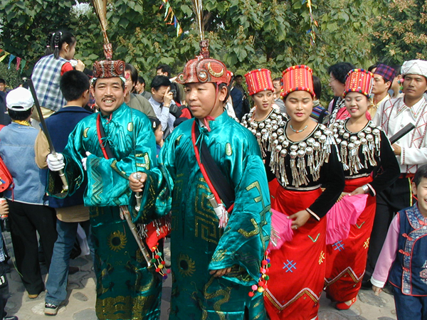 目瑙節:又稱“總戈”,景頗語音譯,意思是“大伙跳舞”。目瑙節是景頗族最盛大的傳統節日,一般于每年農歷正月十五以后的九天內擇雙日舉行,節期三至五天不等。目瑙作為一種大型的群眾性歌舞活動,由來已久,歷史上,每逢豐年,出征、凱旋、婚姻嫁娶、敬祭鬼神等重要活動,均要跳“目瑙”。景頗族的“目瑙縱歌”原來是一種融宗教和文化習俗為一體的傳統慶典。隨著社會的發展,逐漸演化為各種不同類別的“目瑙”。大致有以下幾種:①“歲目瑙”,家庭財源茂盛,人丁興旺時舉行;②“布當目瑙”,征戰取得勝利時舉行;③“貢冉目瑙”,同胞兄弟分家自立門戶時舉行;④“騰肯目瑙”,新建房屋住所落成時舉行;⑤“空然目瑙”貴族家娶親辦婚禮時舉行;⑥“達如目瑙”,出征時舉行;⑦“昔目瑙”,有名望的長者去世送葬時舉行;⑧“柱目瑙”,祭奠“木代”神時舉行。不同類別的“目瑙”都有特定的內容和表現形式,但有一個共同點就是整個過程都是由“瑙雙”(領舞)隊和“瑙巴”(表演)隊組成的舞隊來表現和完成的。每逢目瑙節日,村村寨寨的景頗人身著節日盛裝,紛紛從四面八方涌入目瑙廣場。廣場上人山人海,氣氛熱烈歡快而不失莊嚴古樸的特色。廣場中央高豎著四根長約4米的目瑙柱,亦稱雌雄柱,中間兩根為陰,外面兩根為陽,上面皆繪有精美而富有象征意義的圖案:右邊柱上往往繪以蕨菜花紋,象征團結奮進;左邊常畫回紋構成若干個四方形,并涂以不同顏色,表示景頗族的遷徙路線;中間兩根柱子之間,交叉著兩把長刀,為景頗民族驍勇強悍、堅強剛毅性格的具體標志。目瑙柱的左側立著一個方形架子,上層是吹嗩吶的座位;前面掛著一個兩米長的大皮鼓和一面直徑一米多的大芒鑼,供跳舞時伴奏用。廣場四周用竹籬笆圍起,目的是為了防止野鬼的侵入和牲畜的干擾。舞蹈開始時,鼓樂齊鳴,由兩位德高望重且又熟悉目瑙舞路線的老人身穿大龍袍,頭戴飾有孔雀、野雞羽毛和野豬牙齒的目腦帽,手持長刀領頭,后面跟著背銅炮和持長刀的隊伍,婦女們拿著扇子或彩帕跟在最后,邊歌邊舞,熱鬧非凡。參舞者少則百多人,多則幾千人,從清晨到日暮,以日暮到清晨,通宵達旦,其間舞者跳累時可自動退場小歇片刻,然后繼續登場舞蹈。“目瑙縱歌”作為一個民族的傳統活動發展至今,宗教色彩和類別已日益淡化,它已成為景頗族約定俗成的傳統節日,統稱為“統肯(傳統)目瑙”并賦予了新的內涵,其內容和形式都是展示一個民族的傳統文化,反映今天的新生活和對未來的美好向往。