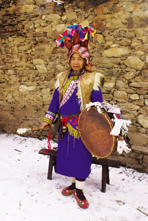“釋比”是羌族對宗教儀式執行者的尊稱,漢語稱之為“端公”,是羌族文化知識的集大成者。釋比頭戴的猴皮帽和手中的羊皮鼓現在已成為珍貴的民族文物