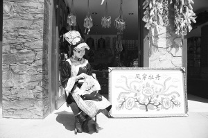 午后,張國麗文文靜靜地坐在店前刺繡,繡帕上是一對鮮活的鴦鴦。“瀟灑、飄逸、俊秀是張國麗刺繡創作的風格,許多來旅游的人都是這樣評價的。她獨樹一幟,盡情彰顯了羌風羌韻?!痹樠鄧烂C認真地解說。