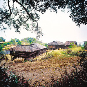 云南省潞西市三臺山鄉的德昂族居住分散,村寨很小,大都建在高半山上,山路行車困難。傳統住房為正方形干欄式竹木建筑,房屋兩層,為木柱結構框架,竹篾編片圍墻,粗竹劈壓成自然的竹片做樓板,屋頂苫草排,當地俗稱“草帽頂房。”
