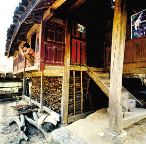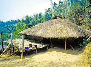 樓上住人、煮飯、貯藏糧食,樓下圈養牲畜。以簡易板梯上下,有小廊道。室內順梁開前后兩道門,中間的通道將屋內分成兩部分。右側為客房,設火塘,供佛像;左側為家人臥房,以竹篾隨意分隔,無門,只擋一布簾,通風透光。正門一邊搭曬臺,用來曬糧、曬衣服和洗漱。住房一側多建有附房,用以堆柴、舂米、放置生產工具和雜物。