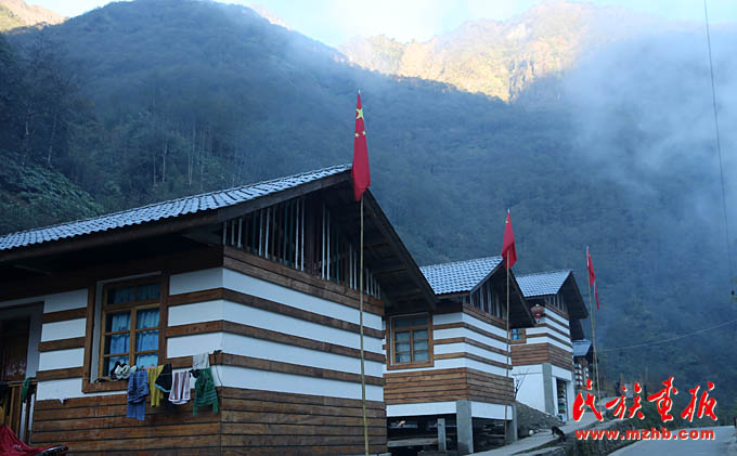 國家大力支持發展獨龍族社會事業,真正為獨龍族百姓謀福利。獨龍族居民房屋前,家家掛著鮮艷的五星紅旗