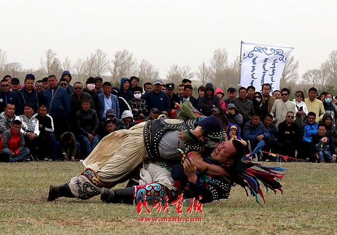 巴音昌呼格草原舉行。圖為被授予“將嘎”(彩帶)的鄂爾多斯搏克們