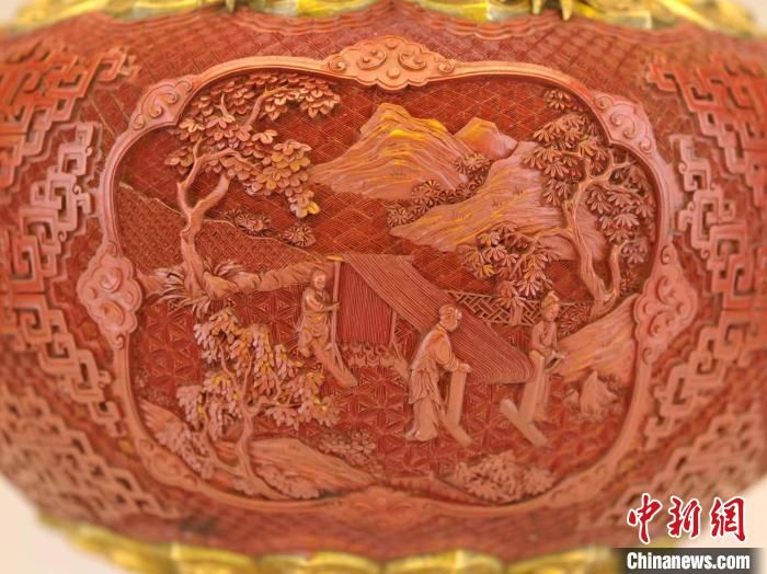 沈陽故宮博物館相關負責人表示,此件漆器工不厭精,裝飾富麗,帶有乾隆朝剔紅漆器精致華美、大氣雍容的時代風格,反映了清代盛世的審美趣味。男耕女織的雕刻圖景反映清朝統(tǒng)治者以農桑為治國之本的思想觀念。此次沈陽故宮展出乾隆款剔紅開光山水人物紋龍耳瓶,意在用文物展現(xiàn)中華文明之美,讓人們感受中國傳統(tǒng)藝術珍品的博大精深和意境之美。