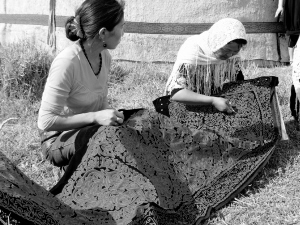 秋來春往,花落花開,瑪利亞從小女孩長成大姑娘,她的繡藝也日漸嫻熟,結繡、鉤繡、扎繡、刺繡、串珠片繡、格子架繡、十字繡……在日復一日的飛針走線中,她練就了一雙巧手和溫柔內斂的性格。瑪利亞繡花,先勾勒花朵的輪廓,再用細的色線填滿輪廓內的空間,由外向內,一圈一圈、一層一層,直到色彩飽滿的圖案凸現出來。草原上黃色的野菊、白色的蒲公英、藍色的薰衣草、紅色的刺玫,都像被擷取了精靈似的,綻放在柯爾克孜女人的繡品中,流露出她們與自然界溫暖而平和的情感交流。