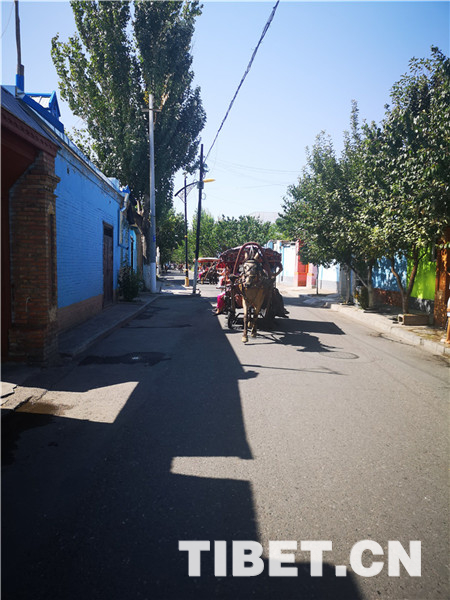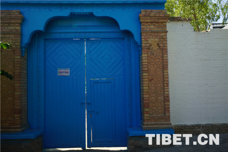 目前,喀贊其仍保留著一定數量的文物古跡,包括自治區級文物保護單位1個(陜西回族大寺),市級文物保護單位7個,另有12處清真寺建筑。圖為具有當地特色的臨街藍色大門。