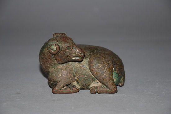 銅羊做蹲臥式,盤角,回首,兩眼凝視,似乎聞聲將起,體型肥碩,神態溫馴、生動活潑,栩栩如生。在鑄造上工匠利用傳統的錯金銀工藝,用金絲銀線鑲嵌全身,凸顯出羊首輪廓和纖細卷曲的絨毛,金光銀彩交相輝映,更顯得生氣盎然。兩漢時期不但繼承了先秦時代已有的錯金銀技術,而且還有一定的創新,工藝更為精湛。