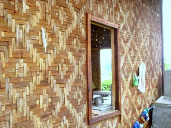 上層近梯處有一露臺(tái),轉(zhuǎn)進(jìn)為長(zhǎng)形大房,用竹籬隔出主人臥室并兼重要錢(qián)物存儲(chǔ)處。其余為一大敞間,屋頂不甚高,兩邊傾斜,屋檐及于樓板,一般無(wú)窗。若屋檐稍高則兩側(cè)開(kāi)有小窗,后面開(kāi)一門(mén)。樓中央是一個(gè)火塘,日夜燃燒不熄。屋頂用茅草鋪蓋,梁柱門(mén)窗樓板全部用竹制成。