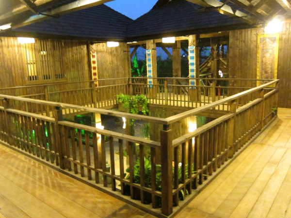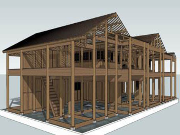 傣族竹樓下層高約七八尺,竹樓下有較大的空地作院子,四無(wú)遮欄,牛馬拴束于柱上。整個(gè)竹樓呈正方形,分上下兩層,樓上住人,樓下一般作關(guān)牲口和堆柴禾用。竹樓由二十至二十四根柱子支撐。屋內(nèi)橫梁穿柱。有的橫梁上雕刻著花紋。離地七八尺處鋪樓板或竹蔑,將樓房隔為兩層。屋頂用茅草編織的草排或木片覆蓋,今年也有很多改為瓦頂。