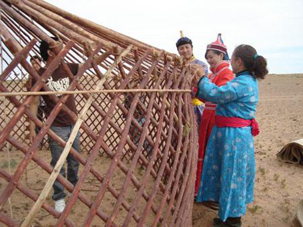 帶子。蒙古包的帶子、圍繩、壓繩、捆繩、墜繩的作用是:保持蒙古包的形狀,防止哈那向外炸開,使頂棚、圍氈不致下滑,在風(fēng)中掀起來。(可以保證其中的人的安全性)總之,對保持蒙古包的穩(wěn)固堅(jiān)定和延長壽命都有很大的關(guān)系。