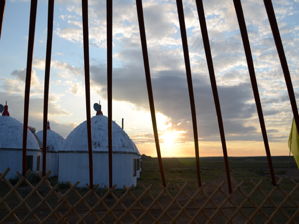氈門。哈那立起來以后,把網(wǎng)眼大小調(diào)節(jié)好,哈那的高度就是門框的高度。門由框定。因此蒙古包的門不能太高,人得彎著腰進(jìn)。氈門要吊在外面。