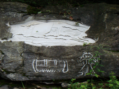 筆者在該村所見的具有“文化生態村”建設痕跡,除了村口巨石上鐫刻的文字外,還修建了一條貫通項目組專家們規劃的“文化生態展示區”的石板路,并在作為展示重要文化景觀的地方豎立了介紹或解釋性的文字標牌。如,村口、山神廟前、摔跤場等都立有介紹的招牌。讓筆者疑惑和認為不應該“改造”的是在村民們的祖靈洞巖壁上的“藝術石刻”(見圖)。從筆者與村民的訪談和項目組的總結報告資料中,可以把文化生態村建設試點項目組在月湖開展的文化保護工作歸結為如下幾個方面: