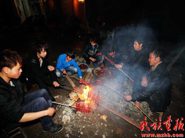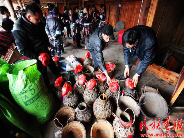 第一天的婚宴在上午11時左右開始,來參加婚禮的客人都要帶上彩禮,臨近主人家門時還要燃放鞭炮,主人則熱情相迎。彩禮主要包括稻谷、米酒、土布和數量不等的人民幣,人民幣有單獨給的也有和實物放在一起給的。主人對客人送的彩禮要及時登記造冊,以便婚宴結束后要給送實物彩禮的客人還禮。婚宴的地點均設在房前屋后的院子里、馬路邊或臨近鼓樓的廣場上,一般都有十多桌。桌上的菜肴除了紅肉、燉肉和烤肉外,還有各種酸菜及炒菜等,共有十來個,主食是小黃當地自產的糯米飯,酒水則以自家釀制的米酒為主。婚宴開始,人們邊品嘗豐盛的菜肴邊開懷暢飲,主人不停地為客人敬酒添菜。特別值得一提的是,在侗族婚宴上新娘不出來敬酒;人們飲酒時也比較文明,沒有過分勸酒現象;還有就是對老年人格外尊敬:寨老們要專門設一桌,并且坐在上席,屆時這些寨老們還要穿上漂亮的民族服裝,纏上頭帕,成為婚禮上另一道靚麗風景線。