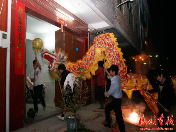 鼓聲起,鑼鼓響,鞭炮鳴。一片歡呼聲中,“龍”忽上忽下,左搖右擺地從承啟樓游出。由于五云樓是幾座土樓中最老的一座,里面還供奉著江集成及其夫人的塑像,所以拜訪從那里開始。進入五云樓,“龍”首先來到中堂,三鞠躬,敬拜祖先和觀音。然后,“龍”開始去樓里每戶家里拜訪,各家紛紛燃放鞭炮迎接龍的到來。從五云樓出來后,“龍”前往保生大帝廟參拜諸神。據記者觀察,只要途中路過寺廟佛堂和樹神所在地,“龍”都會去參拜。
