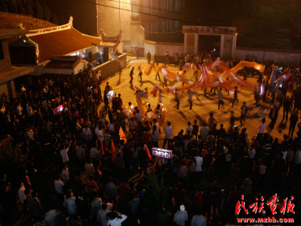 晚上十點半,在農村,這已經可以算作深夜了。但承啟樓門前依然聚滿了人,其他地區舞龍隊的不斷光臨讓這里也是鞭炮聲不斷。雖然累,從高南返回承啟樓的舞龍隊隊員們依然興奮不已,他們在樓前的馬路上攔住過往的其他村舞龍隊,要求共舞一場。