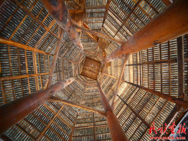 鼓樓四周墻體采用柵欄形式,柵欄內部通常有12根大柱子構成第二層柱網序列,鼓樓內部通常有4根主柱,支撐著鼓樓主要結構及屋頂的重量,4根主柱建立了固定的、中性空間領域。這種構成法使得鼓樓內部空間與外部空間保持著視覺的連續性,使得鼓樓與村寨在空間上產生融合性和內聚力,鼓樓的中心是火塘。