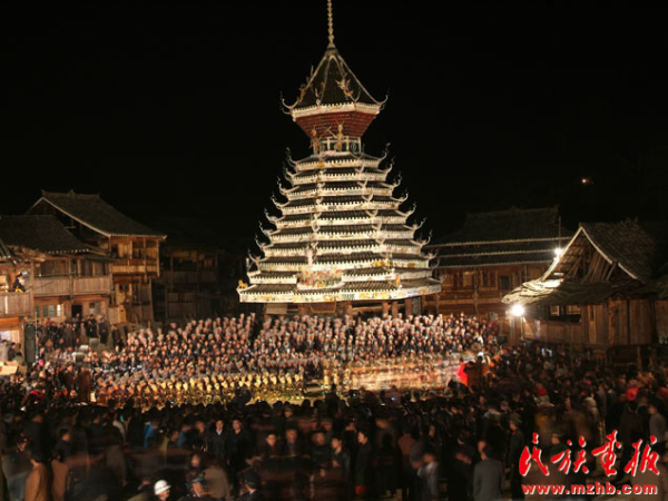 后來,鼓樓功能逐漸擴大,不僅有擊鼓報信,召集族人議事的場所功能,還成為村寨的娛樂休閑中心。鼓樓在侗語叫“百”,意為“扎堆”、“聚集”。農閑時節或耕作之余,人們來到鼓樓下聊天、唱歌、講故事。每逢喜慶節日,盛裝的侗家人就會在鼓樓坪歡聚一堂,吹蘆笙、踩歌堂,演侗戲,年輕人甚至利用這個場所對歌敘情、談情說愛。正如侗族民歌中所唱“鼓樓是村寨的暖和窩,沒有鼓樓無處尋歡樂,高高的杉木豎起鼓樓來,有了聚集的地方有了歡樂的歌”,這些正是對鼓樓功能擴大的最好佐證。