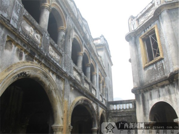 如果說尚德堂是中西混血兒的話,他的兄弟“松柏莊”就是純正的“英國帥哥”。“松柏莊”具有英國新式古典建筑風格,共分為兩層,北面設有陽臺。陽臺及門窗上部均是圓弧形,用帶有高級的石膏線勾邊。陽臺由數十條羅馬柱支撐,檐口用西洋線腳裝飾,具有英國新式古典建筑風格。建筑墻體為白色,與墻上“松柏莊”三個黑色大字相映,十分顯眼,盡顯歐式建筑色彩的視覺沖擊效果。老宅有些殘舊,但墻上的雕畫仍然凹凸有致,圖案清晰可見,這無一不表露這家主人曾經的輝煌。