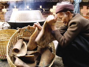 據(jù)曼滿村的傣族老人介紹,制作泡牛皮的材料是水牛皮,黃牛皮太薄是不行的。水牛皮買回家后,第一道工序是去毛。將牛皮用沸水燙后,刮盡上面的牛毛,剔掉附著的筋肉,再將牛皮煮至用竹筷稍用力可穿透為止。第二道工序是晾涼,刮去牛皮的上下兩層,將中間一層純皮切成長10厘米、寬1至2厘米的條狀,然后,將其曬成干品,放進(jìn)60℃左右的油鍋內(nèi)浸泡24小時(shí),撈出,濾油曬干,供油炸用。要吃的時(shí)候,把曬干的條狀牛皮放入熱油鍋中,文火加熱,直至牛皮像油條一樣發(fā)泡、微黃時(shí),取出食用即可。