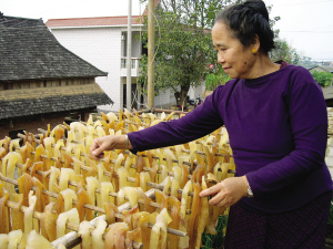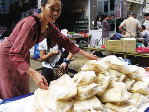 每天清晨,云南西雙版納傣族自治州景洪市嘎灑鎮(zhèn)集貿(mào)市場賣泡牛皮的傣族老咪濤(傣語意為“老阿媽”),都要忙得不亦樂乎。前來購買泡牛皮的餐廳老板絡(luò)繹不絕。因?yàn)榇黾遗菖Fど钍苋藗兊南矏郏陙恚S著“傣家樂”餐廳如雨后春筍般崛起,賣泡牛皮的老咪濤生意越來越好。