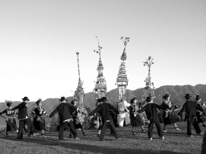 登窩羅時,領唱的人在前,這人叫“稍干”。其他人雙手叉腰,跟著稍干唱。邊唱邊大蹲大跳,一會兒背對背,一會兒面對面。春節圍著窩羅牌坊跳,平時圍著一張擺滿煙酒茶果的桌子跳,意思是圍著太陽、月亮轉。