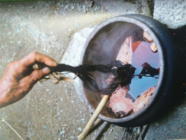 “染”是指紗線染色,包括美孚方言婦女在白色經線上扎結成所需的花紋,再染成黑白斑花的經線,然后用彩色緯線編織出色彩斑斕的筒裙圖案。