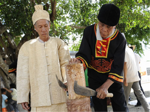 黎族樹皮布制作技藝:黎族制作樹皮布的歷史悠久,樹皮布是人類衣物從無紡布向有紡布發展的歷史見證。據考古學家研究,海南島樹皮布的歷史約有4000年。延續了數千年的樹皮布,記載了人類發展的歷程。盡管樹皮布已失去了它往日的作用,可是黎族人民卻不能忘記祖輩傳承下來的技藝。如今在哈方言、潤方言黎族中,有些家庭將制作樹皮布的技藝代代相傳,他們的子孫仍能識別制作樹皮布的樹種,并能掌握制作樹皮布的技術,這對研究黎族早期無紡布有著重要的意義。然而,目前整個海南省掌握樹皮布制作技藝的民間藝人不足5人。