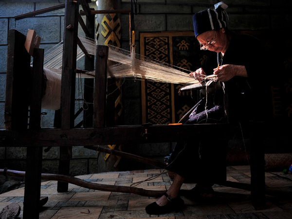“織”是指使用踞腰織機,采用通經斷緯的紡織方法織出各種花紋圖案,在織布時,先手工掛經,綁住藤或樹皮布腰帶,用腳踩織機的經線木棍,席地而坐織布。織花是用黑色或藍黑色做底線(經線),根據圖案需要,將各種染色的線搭配,拉經線、投緯線(彩色線),用木刀打緊緯線,織出各種花紋圖案。