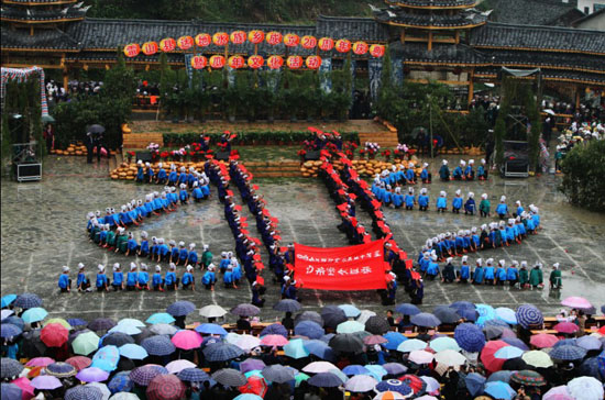 圖為(雷山達地水族鄉)雨中表演水書 (原載中國網·中國民族) 引自民族畫報