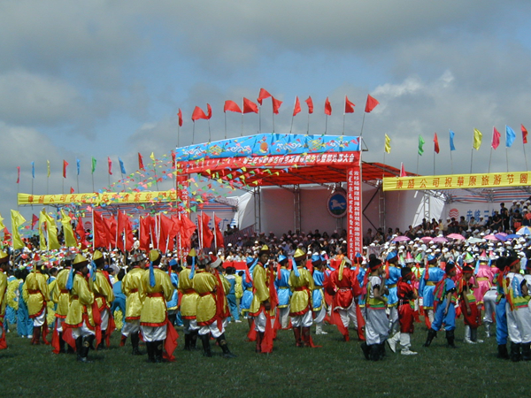 大草原最宜人的時節(jié)莫過于七八月。屆時,蒙古族牧民們,就會穿上盛裝,不管路途多遠,男女老少,舉家乘車騎馬,云集到綠海如茵的草原上。世界各地的游人也會紛至沓來,素日寧靜的草原頓時沸騰起來,藍天白云之下,彩旗飄揚,人流涌動,羊歡馬叫,呈一派繁榮景象。這就是蒙古民族一年一度的草原盛大節(jié)日——那達慕大會隆重開幕。