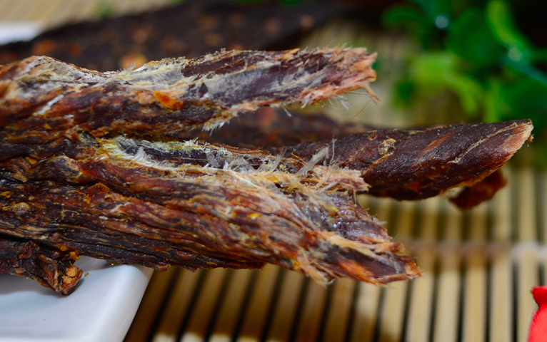四川、云南等地的藏族多將豬肉制成豬膘。制豬膘時(shí),去掉豬的頭蹄,剔除豬骨,四川的藏族還要割下瘦肉,然后抹上花椒、香樟籽,撒上鹽,縫合成方形,風(fēng)干即可。云南藏族在將豬肉縫合之后,還要加一塊重石板壓,稱(chēng)“琵琶肉”。食用時(shí)一圈圈切下,蒸熟后用刀切食。肉類(lèi)的儲(chǔ)存多用風(fēng)干法。一般在入冬后宰殺的牛羊肉一時(shí)食用不了,多切成條塊,掛在通風(fēng)處風(fēng)干。冬季制作風(fēng)干肉,因氣溫低,既可防腐,又可使肉中的血水凍附肉中,保持肉的營(yíng)養(yǎng)和風(fēng)味。云南藏族稱(chēng)這種風(fēng)干肉為牛羊干巴。