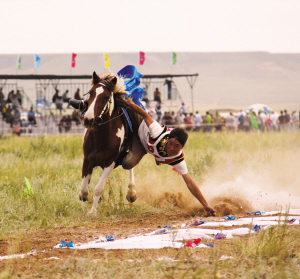9日,在錫林郭勒盟阿巴嘎旗草原上,蒙古族選手們表演的騎馬射擊、騎馬射箭和騎馬拾哈達(即“馬上三藝”),讓來自俄羅斯、蒙古國、德國、臺灣等地的游客大開眼界。