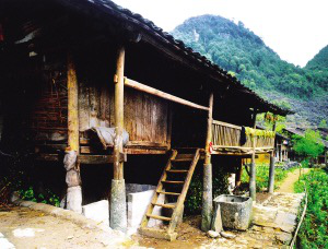 為適應濕瘴環境,吊腳樓房屋兩層的較多,下層圈養家畜,堆放雜物,二層為居住生活層。前檐的4根立柱用圓柱形礎石支墊,這種石木結合,既古樸又穩重。在廣西百色地區的那坡縣,世居著以黑為美的壯家人,因大山深處交通閉塞,至今傳統文化濃郁,成為廣西壯族自治區研究壯族文化的基地之一。