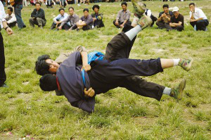 迎親宴畢,一般都要舉行摔跤比賽。先由女方家派人用酒邀請,接親隊伍應邀派出選手。在比賽中,只有把對方摔倒在地才算贏,如果雙方同時倒地,則比賽無效。