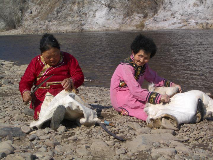 鄂倫春人過去在家庭公社“烏力鄰”里,同生產(chǎn)共消費(fèi),在當(dāng)時(shí)生產(chǎn)力十分低下的情況下,憑著扎槍和弓箭,單個(gè)人很難獲得能夠滿足衣食需要的獵物,必須要有“烏力鄰”全體成員的通力合作,才能戰(zhàn)勝兇猛和龐大的野獸,所以,在“塔坦達(dá)”領(lǐng)導(dǎo)下的集體狩獵是當(dāng)時(shí)最主要的勞動(dòng)形式。隨著生產(chǎn)力的不斷發(fā)展和個(gè)體小家庭的大量流動(dòng),不僅社會(huì)組織“烏力鄰”由原來血緣性的家庭公社演變?yōu)榈鼐壭缘牡赜蚬纾瑒趧?dòng)組織也隨之發(fā)生了極大的變化。集體狩獵已不再是“烏力鄰”傾巢出動(dòng),而是由幾個(gè)小家庭的成員自愿結(jié)合成“安嘎”來進(jìn)行。同時(shí)還出現(xiàn)了集體和個(gè)人等多種勞動(dòng)形式。狩獵也不再單純是為了滿足衣食的需要,剩余獵物可以拿去交換,獵產(chǎn)品已趨于商品化。故此時(shí)一些珍貴的細(xì)毛皮張和藥用價(jià)值較高的獸類,成了鄂倫春人主要的狩獵目標(biāo)。這樣就形成了一年中的四個(gè)狩獵旺季,即:農(nóng)歷正月至2月是“鹿胎期”;4月至6月是“鹿茸期”;9月至落雪為“叫鹿尾期”;落雪后至來年開春是“打皮子期”。大概是源于原始的圍獵,鄂倫春人把狩獵叫“打圍”,而這四個(gè)狩獵旺季就叫“紅圍期”。“紅圍期”除“叫鹿尾期”外,都組織“安嘎”集體出獵。“安嘎”是一種臨時(shí)性的狩獵組織,狩獵旺季將臨時(shí),由一人發(fā)起,串聯(lián)幾位親朋好友或志趣相投的人組成一個(gè)“安嘎”,待獵期結(jié)束,“安嘎”自行解散,下次出獵時(shí)再重新組合,因此其成員并不是固定的(圖為熟化狍皮,吳雅芝攝影)。