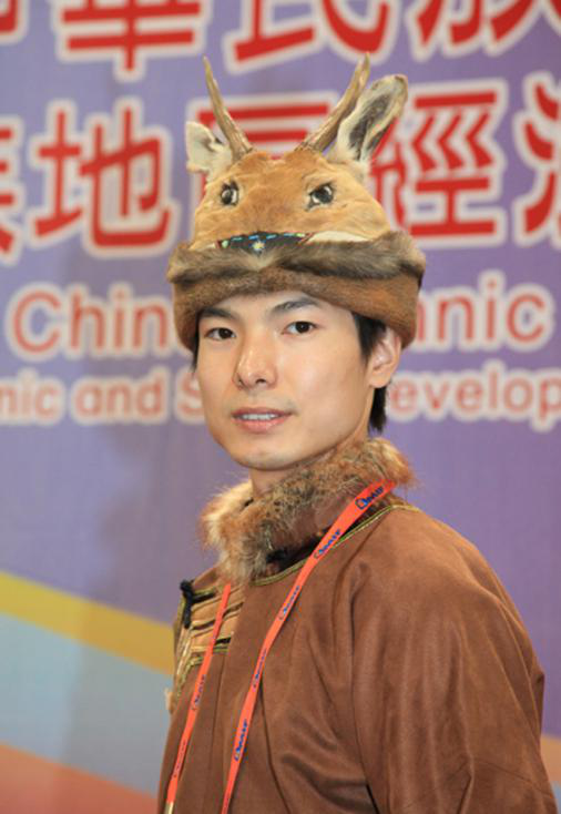 游獵時期鄂倫春人的服飾基本都是用獸皮制作的。用獸皮縫制衣服,首先要熟化獸皮,先把皮子曬干,將煮熟的狍肝搗爛,涂抹在皮板上再噴一些水,包好悶幾天,使皮板變軟。熟皮子時坐在地上,用雙腳夾住皮子的一角,先用“克得熱”(約二尺長的弧形帶鋸齒刮具)反復刮揉,待皮膜和污垢暴起,再用“毛擔”(又稱“毛賀得勒”,約二尺長的弧形鈍刃刮刀)刮掉,就這樣反復揉刮,直至皮板柔軟且富有彈性為止。最后,幾個人配合,將柔軟的皮張放在朽木火上,一邊熏烤一邊均力拉伸,皮張就變得平平展展了(右圖為鄂倫春傳統服飾,頭戴狍頭帽,劉軍供圖)。