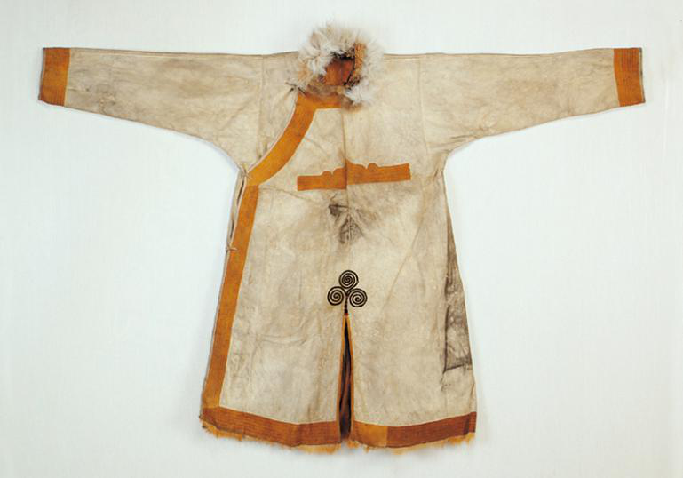縫制衣服的針最初都是骨和木制的,將狍子的小腿骨加工成細骨簽,再在石頭上磨成骨針。據說用落葉松的心木做成的針比骨針還硬。縫制厚皮衣物時,比如上鞋底,骨針和木針都扎不動,他們又用狍角制成角錐。頂針也是用獸骨制作的,鄂倫春族婦女縫制衣服時不像漢族那樣將頂針戴在中指上,拉線的時候針尖朝外。她們是將頂針戴在食指上,拉線的時候讓針尖朝自己,為的是避免扎到別人。獸皮服裝必須要用獸筋線縫紉。把涼干了的狍、鹿和犴筋,用木錘砸成綿軟的纖維,在搓成細細的線就可以使用了。用獸筋線縫紉的皮衣褲,即使剮壞了、磨爛了,卻始終不存在開線的問題(上圖為鄂倫春傳統服裝——狍皮袍,劉軍供圖)。