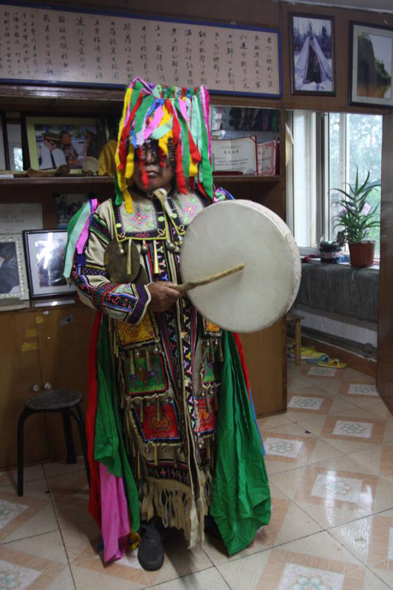冬天穿的鞋是“奇哈密”和“溫得”,“奇哈密”是用狍脖皮或犴皮做靴底,用狍腿皮拼縫成靿的短靴。“溫得”是用鹿或犴皮做底,鹿或犴腿皮拼縫成靿的長靴。“溫得”因為靿高,冬天穿著打獵不易灌雪。這兩種靴子都要用冬季絨毛狍皮做成的襪子配套穿用,暖和跟腳,踩在雪地上沒有聲響。夏天一般穿“奧勞其”,是一種皮底布靿短靴。“考呼落”,是用冬季絨毛狍皮縫制的二指手套,掌面腕部留一縫口,手從縫口中伸出,手套仍護在手背上,既使在零下40度的嚴寒中處理獵物,也不用擔心手被凍壞。還有一種五指狍皮手套,背面正中繡花、蝶等中心圖案,五指的關節和指甲處繡出各種小型圖案,然后用連理枝將中心圖案和關節、指甲圖案連為一體,中心圖案代表手掌,手指圖案代表關節和指甲,連理枝代表骨骼和血脈(圖為越來越鮮見的薩滿服飾,吳雅芝供圖)。